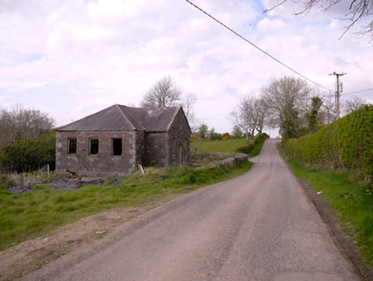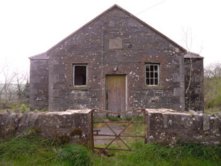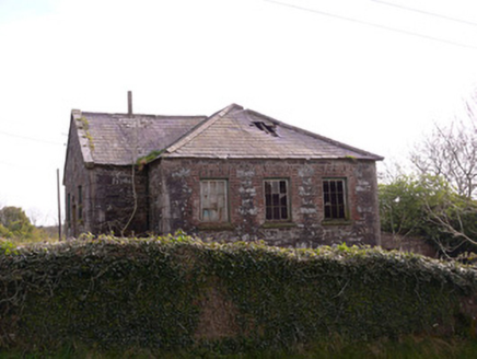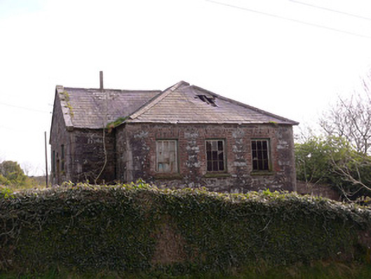Detached T-plan five-bay single-storey national school, dated 1873, with projecting three-bay gabled porch to front (east) elevation. Pitched slate roof with metal flue to ridge, and cast-iron rainwater goods. Dressed stone walls having squared quoins and with plaque over door inscribed: "ANAGLAIVE [sic] NATIONAL SCHOOL 1873". Square-headed window openings having red brick block-and-start surrounds, limestone sills, and remains of nine-pane fixed timber windows. Square-headed door opening with red brick surround, cut-stone plinth blocks, and timber battened door. Later concrete lean-to, now roofless, to rear elevation, and remains of outdoor privies to rear of site. Set back from road having wrought-iron pedestrian gate to front with rubble stone boundary wall. Elevated site with steep drop in levels to surrounding landscape to rear of site.