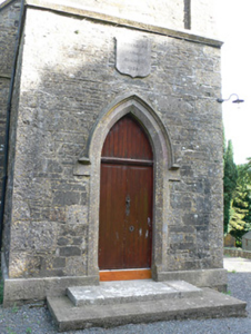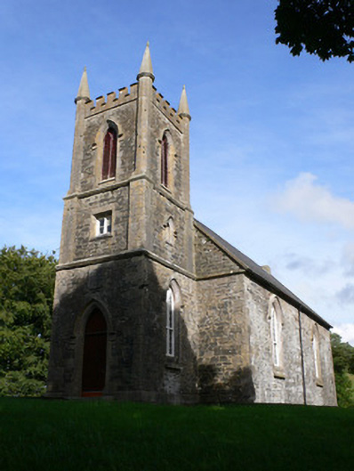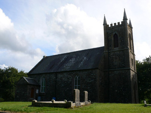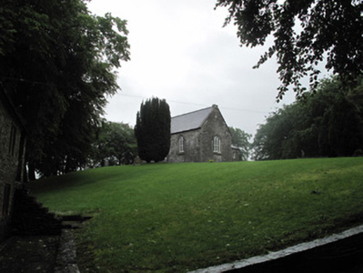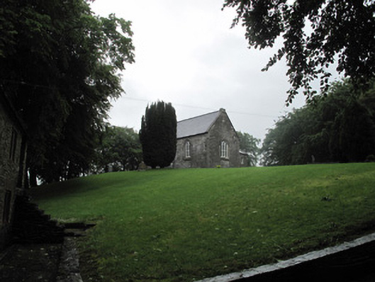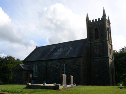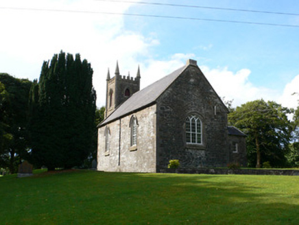 Freestanding limestone-built Church of Ireland church, dated 1828, having two-bay nave, three-stage entrance tower to north and gabled vestry to east. Pitched slate roof having stone copings and cast-iron rainwater goods. Tower with crenellated parapet and spired corner pinnacles. Coursed limestone walls having tooled limestone quoins and plinth, tower also having string courses, and clasping buttresses to upper stages. Tooled limestone date plaque to north elevation of tower, above entrance. Pointed-arch openings having chamfered surrounds, hood-mouldings and sills, and timber Y-traceried windows. Tudor-arch triple-light east window with Y-tracery. Openings to third stage of tower having timber louvres. Square-headed windows openings to front of middle stage of tower having timber double window. Square-headed window opening to east side of vestry having timber window. Entrances to tower and vestry have pointed-arch openings with tooled limestone hood-mouldings and timber panelled doors, double-leaf to tower, with limestone steps. Interior of vestibule has timber tongue-and-groove ceiling and timber ladder to trapdoor. Pointed-arch door opening leading to nave, having timber panelled double-leaf door with timber battened over-door. Exposed rubble walls to interior, withe timber wainscoting to dado level. Exposed king-post truss roof, with tongue-and-grooved timbered to ceiling, upper gables and wall tops. Timber panelled box pews on raised timber platforms flanking central aisle. Carved timber round-plan pulpit having foliate patterned panels and engaged composite columns, cast-iron and timber lectern to front, timber altar table on carpeted steps. Cast-iron and timber altar rail. Church set on elevated site, surrounded by coursed limestone walls with square-plan coursed limestone piers and cast-iron gate.