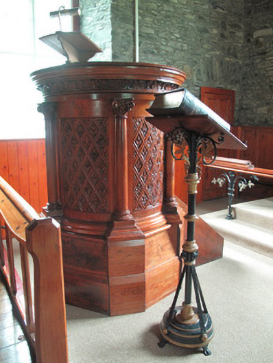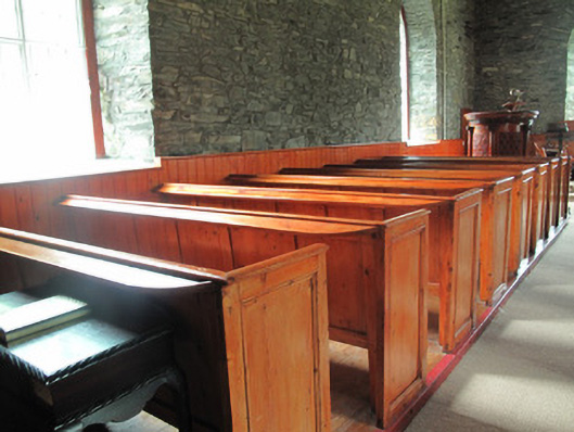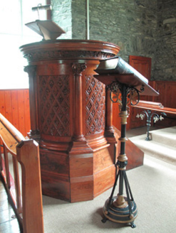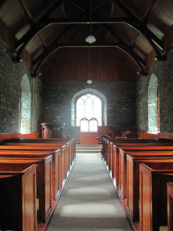 This typical early nineteenth-century Church of Ireland church sits within its own grounds, occupying a pleasant site enhanced by its rural picturesque wooded setting. The attractive traceried windows give the building an artistic quality and add interest to the structure. The fine limestone masonry is clearly the work of skilled craftsmen. It was built as a chapel of ease for Aughnamullen parish with a grant of £900 by the Board of First Fruits, the form being typical of the work of that body, with the entrance through the bell tower and a simple external form. Formerly derelict and restored in the 1990s, the interior of this modest church is subtly enlivened by timber fittings, which enhance its ecclesiastical nature. A highly decorative pulpit provides artistic interest, and timber wainscoting provide a textural and visual contrast to the exposed stone walls.