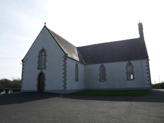 Freestanding T-plan gable-fronted Roman Catholic church, dated 1855, remodelled 1910 to designs by John McGahon of Dundalk. Three-bay nave with two-bay entrance (west) gable, full-height single-bay transepts, full-height shallow chancel to altar (east) end, abutted by flat-roofed single-bay two-storey sacristy. Pitched slate roofs, with stone copings and cross finials, cast-iron rainwater goods; gabled bell-cote with trefoil-headed bell opening having cast-bronze bell, with small trefoil aperture above. Painted smooth rendered walls with painted stone dressings over napped plinth with quoins. Date stone to south elevation of nave. Pointed-arch window openings with painted block-and-start surrounds and painted masonry sills, having timber Y-tracery forming lancet lights with cast-iron mullions. Pointed-arch east window having carved stone mullions and stained-glass lights. Pointed-arch door openings with painted block-and-start surrounds and timber battened doors. Interior has timber panelled galleries to west end of nave and both transepts supported by carved timber posts. Timber panelling to walls below sill level. Arched timber roof with hanging posts atop masonry corbels, and timber cornice with trefoil detailing. Recent timber internal lobbies to all three entrance doors. Timber confession boxes to transepts. Marble altar and reredos on raised floor. Situated with graveyard to west, enclosed by roughcast rendered boundary walls and metal gates to west side, and rubble stone boundary walls with cast-iron gates to south. Recent public toilet building to north edge of car-park.
