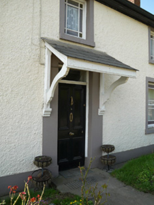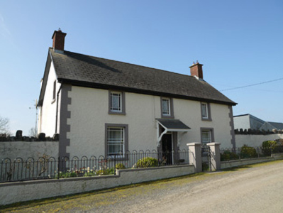 Retaining particularly attractive margined light windows to the front elevation, this house is a good example of the nineteenth-century fashion to use coloured glass for decorative purposes alongside clear glass and slim glazing bars. the building has the classic three-bay two-storey form of so many Irish rural houses.