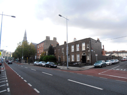 Terraced two-bay two-storey brown brick house, built c.1870. One of group of five. M-profile slate roof behind parapet with granite coping, brown brick and rendered chimneystacks and yellow clay pots, no visible rainwater goods. Brown brick walling laid down in Flemish bond over granite plinth course over rendered walling. Square-headed window openings with gauged brick voussoirs with rendered reveals, masonry sills and two-over-two pane timber sliding sash windows. Original timber shutters visible to interior of first floor windows. Ground floor window blocked, with recent steel window guards to first floor openings. Round-headed door opening in moulded render surround having rendered soffit and reveals. Timber panelled door flanked by engaged pilasters having recessed panels supporting frieze and stepped cornice, plain glazed overlight. Door opens onto granite platform with three granite steps flanked by wrought-iron handrails. Set back from road, bounded by moulded granite plinth wall surmounted by wrought-iron railings with spike finials and corner post.