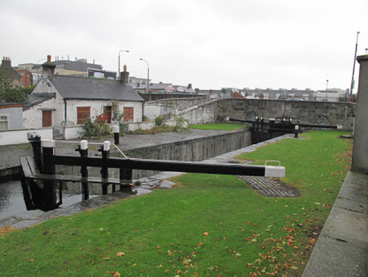 A bridge and lock forming part of the Royal Canal constructed at the turn of the nineteenth-century to improve connectivity and the transportation of freight between the River Liffey and the River Shannon. The bridge, originally identical to Clarke's Bridge (1794) at the junction of Summerhill Parade and Ballybough Road (see 50060476), was impacted when an adjoining bridge was built to carry traffic over the Liffey Branch of the Midland Great Western Railway (MGWR) line opened (1864) by the Midland Great Western Railway (MGWR) Company and was subsequently reconstructed (1873) 'in connection with the new works [at Spencer Docks]...the arch [being] lowered five feet and a new girder iron bridge cross[ing] the railway at the same level' (Freeman's Journal 12th April 1873). The construction of the bridge in a glimmering granite displays good quality workmanship while neo-medieval underpasses framing a Classically-detailed arch elevate it above the merely utilitarian. A pair of creamy Portland stone panels, their inscriptions now barely legible, carry the name of the banker and politician Sir William Gleadowe-Newcomen (né Gleadowe) (1741-1807) who was elected Company Secretary of the Royal Canal Company at its inaugural meeting (13th November 1789). The adjacent lock, originally a double lock under and to the eastern side of the bridge, was 'moved higher up' (ibid.) and makes extensive use of finely-cut cool grey calp limestone: its intake is regulated by two pairs of timber boarded gates. The adjoining railway bridge was replaced in the twentieth century by a reinforced concrete bridge which retained only the rock faced abutments of the original. A lock keeper's house on the western side and the so-called "Effin Bridge", a lifting bridge installed (1878) on the eastern side by Courtney Stephens and Bailey (formed 1865) to designs by Bindon Blood Stoney (1828-1909), contribute positively to the setting of the bridge and lock on North Strand Road.