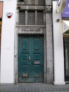 Terraced seven-bay four-storey commercial buidling, built c.1917, with shopfronts to ground floor, and with central pedimented bay. Now in use as commercial premises. Flat roof with shared red brick chimneystacks and concealed gutters behind red brick parapet wall over moulded granite cornice and platband, having engaged red brick pilasters with carved limestone coping. Engaged limestone pilasters flanking dentillated ashlar limestone pediment to central bay. Flemish bond red brick walls having engaged red brick pilasters dividing bays, canted profile red brick pilasters flanking central bay continuing through parapet with limestone finials. Engaged ashlar limestone Ionic pilasters on red brick plinths springing from carved ashlar granite consoles flanking central bay and surmounted by pediment. Moulded granite string course to first floor forming architraves to window openings. Diminishing square-headed window openings with ashlar masonry sills throughout and moulded granite architraves to second floor openings. Masonry cornices to first floor openings, with segmental pediment detail to middle bay and to middle bays of flanking groups, with cornices, architraves and keystones, springing from fluted mullions with panelled capitals. Openings in tripartite arrangements to central bay having three-over-one pane timber sliding sash windows flanked by sidelights. Three-over-one pane timber sliding sash windows elsewhere. Square-headed door opening to east end of ground floor within ashlar stone surround, having double-leaf timber panelled door and tripartite lead-lined overlight, recessed panel to entablature over door having raised lettering "CHAMBERS". Engaged pilaster on plinth base to west of doorway. Recent shopfronts occupy remainder of ground floor.