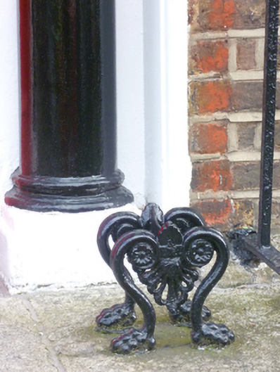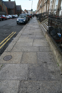 Terraced two-bay three-storey house over raised basement, built c.1830, now in multiple occupancy. Pitched slate roof hidden behind parapet wall with granite coping and shared brick chimneystacks with clay pots. Red brick walls laid in Flemish bond on granite plinth course with rendered walls to basement below. Gauged brick flat-arched window openings with granite sills, rendered surrounds and replacement uPVC windows. Gauged brick three-centred arched door opening with moulded render surround and painted timber Doric doorcase. Original flat-panelled timber door flanked by pair of engaged Ionic columns on plinth bases (with damaged capitals) supporting panelled lintel cornice and original leaded fanlight (encased in glass). Door opens onto granite paved platform and five granite steps to street. Platform enclosed by wrought-iron railing and cast-iron corner posts in turn enclosing basement area and set on moulded granite plinth wall.