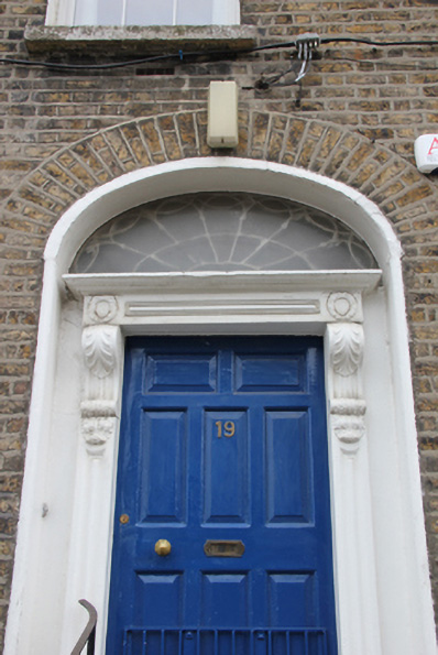 Terraced two-bay three-storey house over raised basement, built c.1830, with single-storey rear return. Now in use as residential children’s home with adjoining building No. 20. M-profile pitched artificial slate roof with central valley set behind rebuilt parapet wall and having stepped rendered brick chimneystacks, shared with adjoining buildings. Brown brick walls laid in Flemish bond to painted granite plinth course and rendered basement wall. Gauged brick flat-arched window openings with patent render reveals, painted stone sills and replacement uPVC sash-type windows. Replacement windows to rear including two round-headed stair windows with replacement timber sliding sash windows. Three-centred arched door opening formed in brick with moulded masonry surround and decorative timber doorcase, and with replacement timber door with ten raised-and-fielded panels, flanked by slender panelled pilasters and scrolled console brackets supporting panelled lintel cornice and original peacock fanlight. Door opens onto granite platform, bridging basement area, and two steps enclosed by wrought-iron railing and twentieth-century iron gates to street. Basement enclosed by original railing on moulded plinth wall with square-headed window opening having ten-over-ten pane timber sliding sash window and iron grille. Rear brick south-facing elevation is two-bay with two round-headed stair landing windows with replacement timber sliding sash windows. Rear south facing rubble stone boundary wall to rear access lane.