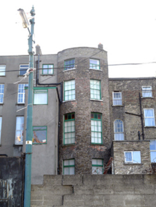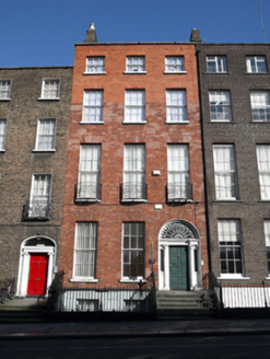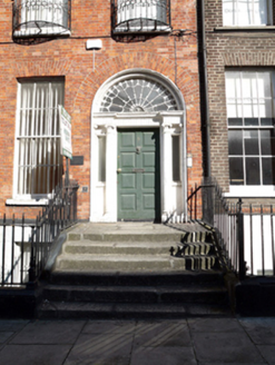 Terraced three-bay four-storey house over raised basement, built c.1800, with full-height bowed rear elevation and three-storey flat-roofed rear return. Currently in use as offices to lower floors and residential to upper floors. Pitched slate roof on T-plan hidden behind rebuilt parapet wall with granite coping. Stepped brick chimneystacks to both party walls with clay pots. Red brick walls laid in Flemish bond, rebuilt in machine-made red brick to top two floors, set on moulded plinth course over painted render walls to basement level. Yellow brick walls to rear elevation with cement render to return. Gauged brick flat-arched window openings with painted granite sills, brick reveals and correctly specified early replacement timber sliding sash windows throughout, six-over-six pane to lower floors and three-over-three pane to top floor. Decorative wrought-iron balconettes to first floor windows. Gauged brick round-headed door opening with painted masonry tripartite Ionic doorcase, with replacement timber door flanked by engaged Ionic columns on plinth blocks, re-glazed sidelights and responding Ionic pilasters all supporting fluted and stepped lintel cornice with original cobweb leaded fanlight. Door opens onto granite platform and six granite steps bridging basement area. Platform enclosed by original wrought-iron railings returning to enclose basement and set on painted moulded granite plinth wall to street. Rear site enclosed by concrete block wall and timber gates.
