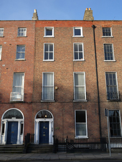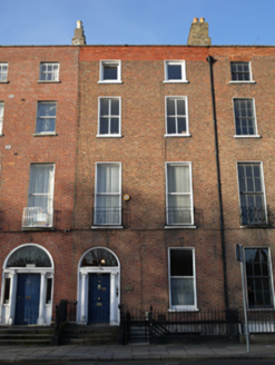 Terraced two-bay four-storey house over exposed basement, built c.1792, having four-storey return to rear (north) elevation. Now in use as offices. Double-pile slate roof, pitched to front (south) elevation, with two hipped projections set perpendicular to rear. Shared brown brick and rendered chimneystacks having clay pots hidden behind rebuilt red brick parapet wall with granite coping. Cast-iron rainwater goods having round hopper to east of façade. Red brick walls laid in Flemish bond with cement pointing to painted granite plinth course over painted rendered wall to basement. Rendered wall to rear having metal balconies and ladders. Gauged brick flat-arched window openings with patent rendered reveals, granite sills and replacement timber sash windows, two-over-two pane to second floor, one-over-one pane to ground and first floors, with recent tripartite one-over-one pane to to basement, and replacement uPVC windows to third floor, cast-iron balconettes to first floor windows. Square-headed window openings to rear having flush reveals, painted sills and replacement uPVC windows. Round-headed door opening with moulded masonry surround and painted stone Ionic doorcase, and replacement timber panelled door flanked by engaged Ionic columns supporting fluted lintel cornice, with plain fanlight. Door opens onto granite platform with three granite steps bridging basement. Platform and basement enclosed by original wrought-iron railings and cast-iron corner posts set on painted moulded granite plinth wall to street having matching iron gate providing basement access. Tiled steps and steel railings to basement. Recent timber door under entrance platform.