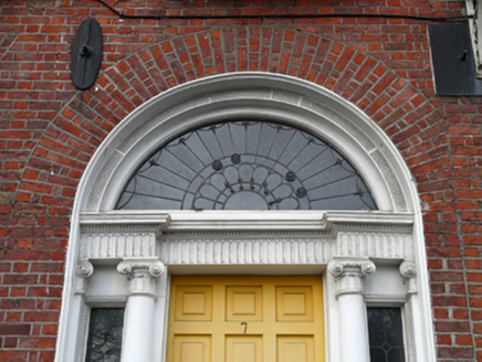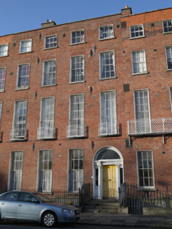 Terraced three-bay four-storey house over raised basement, built c.1792. Now in multiple occupancy. M-profile pitched slate roof having shared brick chimneystacks and clay pots, hidden behind rebuilt red brick parapet wall with granite coping. Red brick wall laid in Flemish bond having flush pointing with cast-iron wall ties to moulded granite plinth course over ruled-and-lined rendered wall to basement. Brown brick finish to rear elevation partially rebuilt in red brick. Gauged brick flat-arch window openings having patent rendered reveals, granite sills and replacement timber sliding sash windows, original nine-over-six pane without horns and with bowed wrought-iron balconettes to first floor, six-over-six pane to basement with grilles, and to second floor, and three-over-three pane to top floor. Block-and-start granite surrounds and steel grilles to windows to basement. Gauged brick round-headed door opening having moulded masonry surround, rendered reveal and painted stone Ionic doorcase, with replacement timber panelled door flanked by engaged Ionic columns, leaded sidelights and quarter engaged responding Ionic pilasters supporting fluted stepped lintel cornice and replacement fanlight with fluted surround. Door opens onto granite platform having stubs of cast-iron bootscrapers and three granite steps bridging basement. Platform and basement enclosed by original wrought-iron railings and cast-iron corner posts set on moulded granite plinth wall to street with matching iron gate providing basement access. Concrete steps having metal railings to basement. Coal hole covers to pavement to front, doors to basement area serving under-pavement stores.