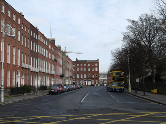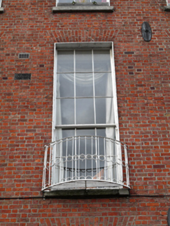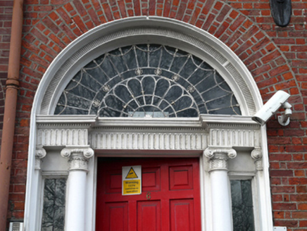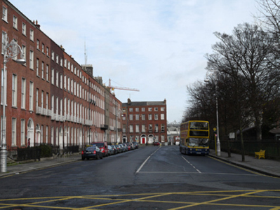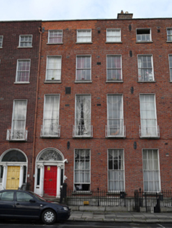 Terraced three-bay four-storey house over raised basement, built c.1792. Now in multiple occupancy. M-profile slate roof, hipped to west to front and rear, shared red brick chimneystack with clay pots to east, hidden behind partly rebuilt red brick parapet wall having granite coping. Red brick wall laid in Flemish bond with flush pointing and cast-iron wall ties to moulded granite plinth course over ruled-and-lined rendered wall to basement. Brown brick finish to rear elevation partially rebuilt in red brick. Gauged brick flat-arch window openings having patent rendered reveals, granite sills and replacement timber sliding sash windows, six-over-six pane to basement, ground and second floors, nine-over-six pane to first floor and three-over-three pane to top floor. Wrought-iron balconettes to first floor windows. Block-and-start granite surrounds and steel grilles to windows to basement. Gauged brick round-arched door opening set within moulded masonry surround with rendered reveal and painted stone Ionic doorcase,with replacement timber panelled door flanked by engaged Ionic columns, leaded sidelights and quarter engaged responding Ionic pilasters supporting fluted stepped lintel cornice and replacement fanlight having fluted surround. Door opens onto granite platform with cast-iron bootscraper and four granite steps bridging basement. Platform and basement enclosed by original wrought-iron railings and cast-iron corner posts set on moulded granite plinth wall to street having matching iron gate providing basement access. Steel steps with metal railings to basement. Square-headed door opening having timber battened door to wall under entrance platform.