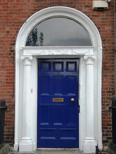 Terraced three-bay four-storey house over exposed basement, built c.1800. Now in multiple residential use. Single-span pitched slate roof, hipped to east with flat roof to rear, hidden behind rebuilt parapet wall with granite coping. Brick chimneystacks with clay pots to west party wall and cast-iron hopper and downpipe breaking through parapet to east end. Red brick walls laid in Flemish bond with cement repairs, on granite plinth course over rendered basement walls. Yellow brick walls to rear elevation laid in Flemish bond with red brick parapet. Gauged brick square-headed window openings with patent rendered reveals, painted granite sills and early replacement timber sliding sash windows, three-over-three pane to top floor and six-over-six pane to lower floors, lacking horns to second floor. Decorative wrought-iron balconettes to first floor windows. Various timber sliding sash and casement windows to rear elevation including round-headed six-over-six pane window with spoked fanlight to stair hall. Round-headed door opening with moulded surround and painted masonry Ionic doorcase. Replacement flat-panelled timber door flanked by engaged Ionic columns on plinth blocks supporting lintel cornice with neo-Classical embellishments and plain fanlight with fluted margin. Door opens onto granite platform with original wrought-iron bootscraper and three granite steps. Platform and basement enclosed by original wrought-iron railings and cast-iron corner posts on moulded granite plinth wall. Matching iron gate gives access to basement via concrete steps. Two cast-iron coal-hole covers set in granite flags flush with granite kerbing.