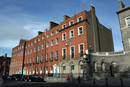 No. 26 forms part of the west terrace of Palace Row, an impressive mid-eighteenth-century streetscape of imposing houses centred on Charlemont House, designed by William Chambers in 1763. The entire terrace was formerly Coláiste Mhuire school, and underwent extensive alteration. This building is enhanced by the simple classical-style doorcase, by the retention of timber sash windows which also contribute to its architectural character, and by the ornate balconettes. The retention also of the moulded steps and the platform to the entrance, and the plinth and railings to the basement area, provides an appropriate and intact meeting of house and street edge. all of this ensures that this house makes a fine contribution to the architectural and streetscape character of theis side of Parnell Square. Interest is added by the subtle advancement and recession of the façades along the terrace. The terrace was fully replete by the 1870s as shown by contemporary maps. The equal-sized plots are thirty-three feet wide, some ten per cent bigger than the standard Dublin plot.
