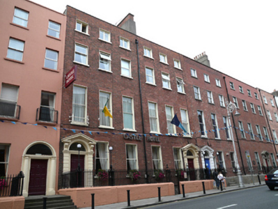 Terraced three-bay four-storey house over exposed basement, built c.1765, now in use as hotel, together with Nos. 1-3 Gardiner Row and No. 2 North Frederick Street. Roof hidden behind rebuilt brick parapet wall with granite coping and single rebuilt chimneystack to party wall. Replacement hopper and downpipe on party line breaking through parapet wall. Red brick walls laid in Flemish bond with red brick repairs on moulded granite plinth course, with ashlar granite walls to basement walls. Rebuilt gauged brick flat-arched window openings with patent rendered reveals, painted granite sills and replacement one-over-one pane timber sliding sash windows to lower two floors and replacement uPVC windows to top two floors. Three-over-three pane timber sliding sash windows to basement with wrought-iron grilles. Matching pedimented painted stone doorcase comprising round-headed door opening with moulded masonry surround and original timber panelled door with six raised-and-fielded panels flanked by rusticated quoined pilasters and stepped lintel cornices, scrolled console brackets supporting open pediment housing plain fanlight. Doorway opens onto tiled platform with two cast-iron bootscrapers and tiled steps enclosed by original wrought-iron railing on painted moulded granite plinth wall terminated by wrought-iron piers supporting replacement iron lamps. Basement area enclosed by original wrought-iron railing on raised painted moulded granite plinth wall with matching gate and concrete steps to basement. Both houses retain good interiors with open-well timber staircases at centre of plan, top-lit and of very generous scale with most original joinery and plasterwork intact.