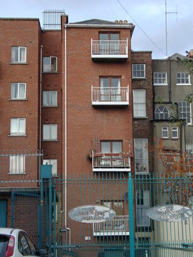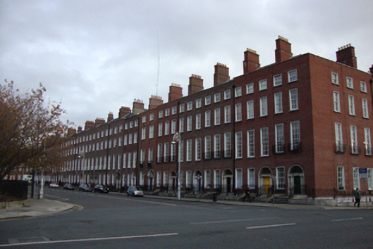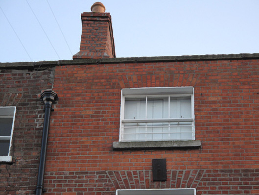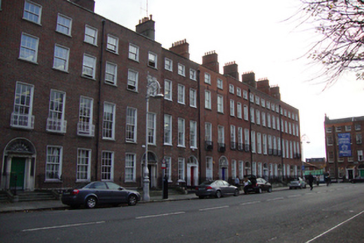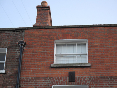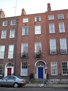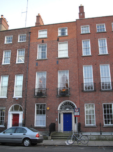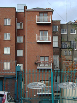 Terraced two-bay four-storey house over exposed basement, built c.1798, with recent single-bay five-storey hipped extension to rear. Now in use as flats. Pitched roof of unknown material to front, with perpendicular pitch to rear and half-pitch to west. Stepped red brick chimneystack with clay pots to east party wall and rebuilt red brick parapet wall with squared granite coping. Cast-iron rainwater goods breaking through to front (north) elevation. Flemish bond red brick wall with granite plinth course and granite platband over rendered walls to basement. Top floor rebuilt. Rear (south) elevation of red brick in English garden wall bond. Gauged brick flat-arched window openings with patent rendered reveals and granite sills, granite block-and-start surrounds to basement window. Replacement timber sliding sash windows to front (north) elevation, six-over-six pane from basement to second floors, and three-over-three pane to top floor. Cast-iron convex balconettes to first floor, and cast-iron grilles to basement. Original timber sliding sash windows to rear elevation, six-over-six pane to basement, ground, and second floors, nine-over-nine pane to first floor, and three-over-three pane to top floor. Round-headed door opening with gauged brick voussoirs and limestone doorcase comprising replacement timber panelled door flanked by engaged Ionic columns on plinth blocks with responding replacement sidelights, stuccoed lintel forming support to replacement fanlight. Door opens onto limestone-flagged platform, having granite-stepped approach bridging basement area. Approach flanked by wrought-iron railings with cast-iron corner finials on moulded plinth with matching gate giving access to basement via turned stone staircase with recent cast-iron handrail and cast-iron door accessing under-street coal bunker. Rear of site flanked by masonry walls and enclosed by steel gate.