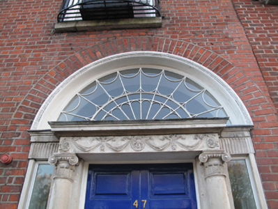 The last of Dublin’s squares to be developed, Mountjoy Square was built c.1789 at the northeast corner of Luke Gardiner’s growing estate and is linked to the Custom House by the recently opened Gardiner Street. The development, with its staggered junctions of secondary streets terminated by four-bay blocks and modest Georgian townhouses, commands an important presence in the city. No. 47 is one of only ten two-bay structures on the square and maintains an elegant but modest appearance subtly enlivened with an exposed limestone doorcase and convex balconettes. Along with No. 46, it is also one of only two extant buildings erected by Archibald Manning. Its ornate, fluid interior is said to boast roundels of putti in the first floor ceiling, marked by an octagon within a rectangle with a leafy centerpiece. The composition and massing of the structure are in keeping with its neighbours, forming an integral part of the rhythmic streetscape. The retention of timber sash windows throughout contributes to the building's architectural character and the retention of stone steps and plinth and cast-iron railing to the street edge provides an appropriate historic setting.