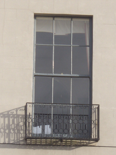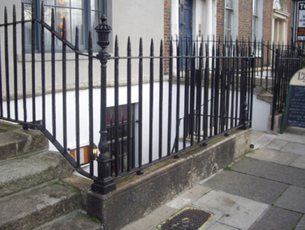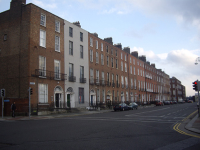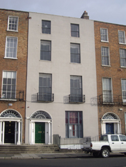 Terraced two-bay four-storey house over exposed basement, built, c.1815, as one of six similar houses. Now in use as restaurant, apartments and offices. Double-pile slate roof with front pitch parallel to street and hipped to north with two sections set perpendicular to rear and hipped behind rear parapet. Stepped brick chimneystacks with clay pots to south party wall hidden behind parapet wall with granite coping. Painted ruled-and-lined rendered walls with chamfered granite plinth course over rendered basement walls. Red brick walls to rear elevation. Square-headed window openings with granite sills and early replacement six-over-six pane timber sliding sash windows, tripartite to ground floor with clustered colonettes to the mullions. Decorative wrought-iron balconettes to first floor windows. Round-headed door opening with moulded stucco surround and painted stone Ionic doorcase. Original timber door with eleven raised-and-fielded panels having moulded jambs and flanked by Ionic columns on plinth bases supporting lintel cornice and decorative leaded cobweb fanlight. Door opens onto shared granite platform and four granite steps bridging basement. Platform and basement enclosed by original wrought-iron railings and cast-iron corner posts set on moulded granite plinth wall to street. Opening cut into granite plinth wall with stone-clad steps providing access to basement.