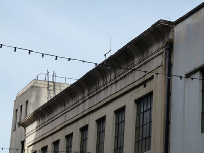 Corner-sited L-plan attached eight-bay two-storey electrical substation and offices, built 1926-28, with three-stage canted corner tower, eight-bay elevation with attic accommodation to west, full-height four-bay extension to east and eight-bay range to rear (north) elevation. Flat roofs hidden behind coved render parapet with render coping, having cast-iron rainwater goods, artificial slate to attic accommodation to west, smooth rendered parapets to extensions. Smooth rendered walls with render plinth course and pilasters dividing bays to ground and first floors, fluted pilasters and fascia framing front and west elevations. Square-headed window openings having multiple pane steel windows, some with metal sills and some having render architraves. Square-headed door openings, that to west elevation with recent steel roller shutter, curved double-leaf door to canted bay and double-leaf timber battened door to south elevation. Located at junction of Bedford Row and Fleet Street.