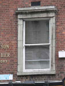 Terraced two-bay five-storey over basement former house and shop, built c.1800, having recent double-height shopfront to front (west) elevation. Now in use as restaurant and offices. M-profile hipped roof concealed behind rebuilt red brick parapet with granite coping, red brick chimneystack having clay pots. Red brick, laid in Flemish bond, to walls. Square-headed window openings with granite sills, carved granite architrave to first floor window openings and one-over-one pane timber sliding sash windows throughout.