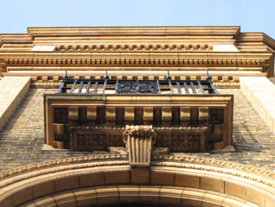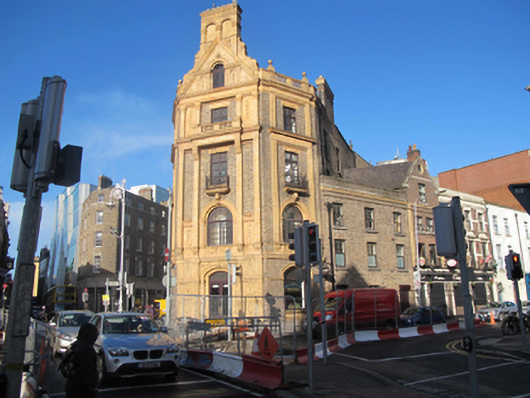 With its form, scale, and elaborate terracotta embellishment, this building is a striking addition to the streetscape. It is prominently sited overlooking the junction of D’Olier Street, Fleet Street, College Street, Pearse Street, Townsend Street and Hawkins Street. D’Olier Chambers was designed and built by the Irish architect J.F. Fuller as the southern branch of Gallagher & Company, tobacco manufacturers. Fuller specified that J.C. Edward’s best buff terracotta and facing bricks were to be used. This is one of a number of late Victorian commercial buildings in Dublin which make extensive use of terracotta, providing textural and tonal variation with the brown brick of the façade. The pedimented breakfronts, surmounted by elaborately detailed chimneystacks, create a remarkable silhouette, and lend diversity to the architectural character of the area.