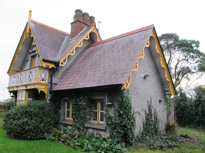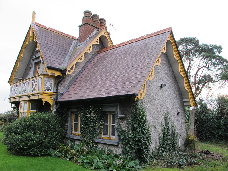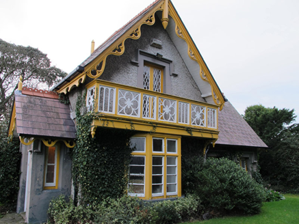 This well-composed gate lodge was associated with St. Ann’s estate, and served one of the main entrances to the demesne. A building appears on this site on the first edition Ordnance Survey map, although its highly decorative appearance suggests it may have undergone refurbishment as part of the improvements undertaken by Lord Ardilaun on his inheritance of the estate in 1868. Lodges such as this were of importance to the demesnes they served, guarding the entrance as well as being representative of the wealth and prosperity of the estate it served. Much attention to detail is evident in the ornately crafted bargeboards and balustrade. The textural contrast between the roughcast rendered walls, masonry details and carved timber work creates a pleasing and picturesque composition. The gateway and remains of an estate wall to the south-east and north-east add contextual interest.