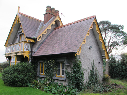Detached single-bay single-storey gate lodge with attic storey, built c. 1830, having gable-fronted porch to front (south-east) elevation, canted-bay window under full-width carved timber balcony to east elevation, and single-storey return with pitched roof to rear (north-west) elevation. Pitched natural slate roof with terracotta ridge cresting, red brick chimneystack, overhanging eaves and decorative carved timber bargeboards and finials. Roughcast rendered walls, with granite platband to front and smooth render to porch. Square-headed window openings, with timber-framed windows, masonry sills and smooth render surrounds and moulded label-mouldings. Double-leaf French doors with leaded lights to balcony. Timber-framed windows with pivoting top-lights and masonry sill to canted-bay window. Pointed arch door opening to front of porch, with chamfered surround and moulded render hood-moulding, replacement door and granite step.