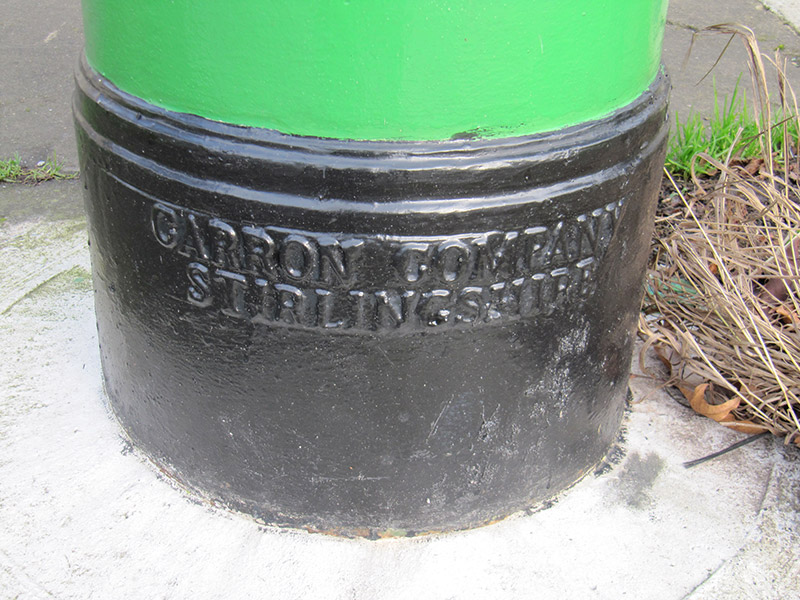 Freestanding cast-iron pillar postbox, erected c. 1965. Shallow domed cap with fluted rim, moulded neck and plinth. Door to front face with letter slot and collection plate. Maker's insignia to rear of plinth reading 'Carron Company Stirlingshire'. Set into footpath in residential area.