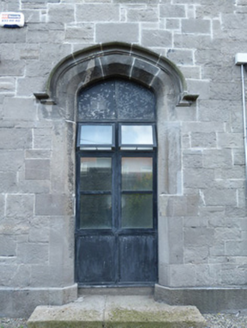 Attached nine-bay two-and-three-storey presbytery with advanced central and end bays, built c.1835-47, and advanced two-bay three-storey linking wing built c.1857-65 to front (north) elevation, and eight-bay three-storey to rear elevation with double-height canted bays with crenellated parapets to east and west ends. Formerly in use also as national school. Single-span hipped slate roof with single-span hipped slate crossing spans to centre and east ends, hidden behind crenelated parapet and ashlar limestone chimneystacks. Hipped slate roof to advanced linking wing. Snecked limestone walls with limestone string courses and carved stone plaque to front elevation. Snecked limestone walls with ashlar limestone quoins to linking wing. Concrete block walls to west elevation. Ruled-and-lined rendered walls to south elevation. Tudor-arch window openings with dressed limestone surrounds and sloping limestone sills with replacement windows, set within Tudor-arch recesses to ground floor. Square-headed window openings with chamfered ashlar limestone reveals and sloping limestone sills, limestone hood-moulding and replacement casement windows to first and second floor. Pointed-arch window openings with dressed limestone reveals and sloping limestone sills and stone tracery to ground floor of linking wing. Twin-light windows with dressed limestone surrounds and sloping limestone sills and replacement windows to first and second floors of linking wing, those to first floor set within gabled dormers. Square-headed window openings with rendered reveals, painted stone sills, rendered hood-mouldings and replacement windows to rear elevation. Square-headed window openings with rendered reveals and granite sills and replacement windows to canted bays. Pointed-arch window opening with twin-light stained-glass window, rendered reveals, granite sills and rendered hood-moulding to east end. Rose window with rendered reveals and rendered hood-moulding over. Pointed-arch door opening with dressed granite surround, and granite hood-moulding, timber double-leaf door with stained-glass over-light, granite platform and steps to presbytery. Tudor-arch door opening with chamfered limestone surround, limestone hood-moulding, granite platform. Snecked limestone screen wall with granite string course, limestone crenellations with granite coping, Tudor-arched entrance with double-leaf gate with granite string course, limestone crenellations, granite corbels, granite coping and granite cross. Red brick wall, laid in English garden wall bond to rear site.