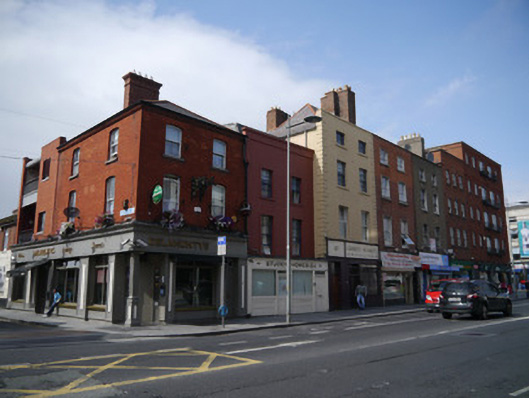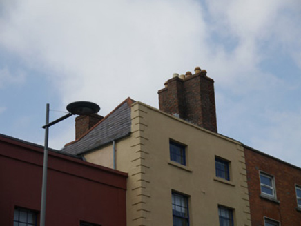 Terraced two-bay four-storey former house, built c.1810, as pair with building to south. Replacement shopfront to ground floor. Upper floors contain flats. Pair of pitched slate roofs (artificial to rear), with flat expanse to centre and hipped to south, rooflights to rear pitch. Solid parapets with painted coping to east, stone to south. Generally angled terracotta ridges and hip tiles, with grey replacements to rear. Replacement metal rainwater goods. Pair of cruciform red brick chimneystacks to north party wall, with clay pots (some replacement). Walling is smooth rendered and painted, with raised stepped quoins to outer east edges, and some painted metal tie-bars. Square-headed window openings, two-storey bow window to rear, having generally stone sills but some concrete replacements and generally six-over-six pane replacement timber sashes, with some replacement uPVC to rear. Shopfront has timber fascia, hand-painted signage, masonry stall-riser with modern timber windows over, and recessed double-leaf timber panelled and glazed door with over-light. Door serving upper floors is timber panelled replacement with over-light. Shop protected behind metal grilles. Street-fronted on Dorset Street Upper, abutted by terraces of similar scale and proportions. Shared yard to rear.