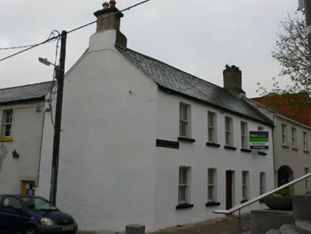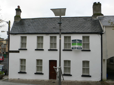 Corner-sited end-of-terrace five-bay two-storey house, built c.1800, with blank gable to southeast. Pitched slate roof with gable-end stepped chimneystacks. Rendered walls. Square-headed openings to first floor and cambered to ground floor, with two-over-two pane timber sliding sash windows and replacement timber battened door. Sited at southern corner of medieval marketplace of Chapelizod.