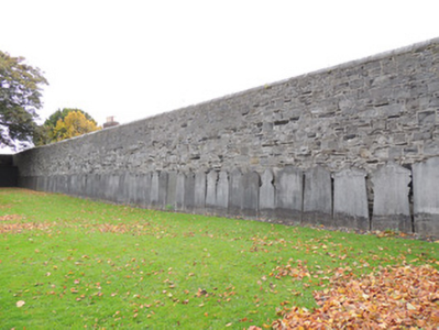 Graveyard, opened c.1850, in grounds of former barracks. Some roughly dressed limestone boundary walls to north, west, and south-east, having cut stone coping. Elliptical-headed door opening to former school master's quarters, now blocked. Central tarmacadam path, with granite kerbstones. Grave markers and tombs to east and west of path, and also re-sited, leaning against east boundary wall and walls of former schools to north. Paved paths through graveyard.