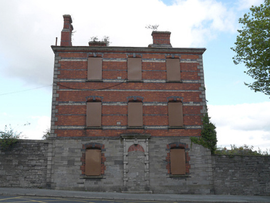 Detached three-bay three-storey former barracks entrance building, built c.1890. Hipped slate roof with central valley. Red and yellow brick cornice to eaves. Red brick chimneystacks having stepped profile and yellow and black decorative courses. Red brick walls having yellow and black brick decorative courses, cut granite platband over snecked ashlar limestone to ground floor. Rusticated granite quoins. Segmental-arched window openings having rounded reveals, black brick keystone detail and cut granite sills. Block-and-start red and black brick surrounds to ground floor windows. Window openings boarded up. Round-headed door opening with carved granite surround having carved cornice supported by brackets and Gibbsian surround with carved keystone. Entrance opening has been infilled with stone and brick. Single granite step from entrance to footpath. Front (west) elevation stands slightly forward of snecked limestone boundary wall.