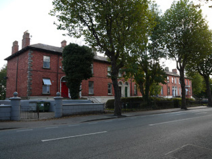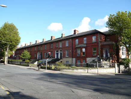 Terrace of eight two-bay two-storey over raised basement houses, built c.1860, some having full-height returns, some with recent extensions. Attached at south-west end to neighbouring house. M-profile shared hipped slate roofs, with timber sheeted eaves with paired brackets. Red brick stepped chimneystacks, some rendered. Hipped roofs with end chimneystacks to returns. Red brick walls laid in Flemish bond to upper floors over rendered walls to basement level. Square-headed window openings having patent reveals, red brick voussoirs, and cut granite sills. One-over-one pane timber sash windows to no.10,l2, 14 and 16. Round-arched door opening having moulded render door surround, with carved door surround set within, comprising pilasters with brackets supporting a cornice. Plain fanlight above. Timber panelled door. Flight of cut granite steps with nosings to entrance platform having cast-iron coal hole to half-landing and wrought-iron railings. Set back from road having front garden enclosed by cast-iron railings on masonry plinth, and matching double-leaf pedestrian gates.
