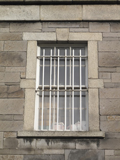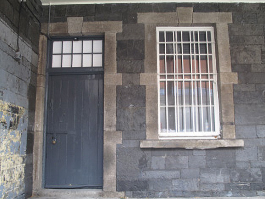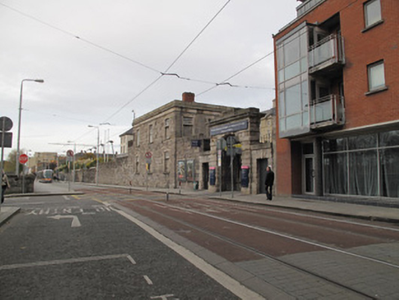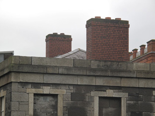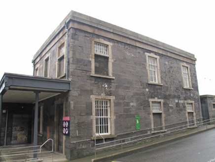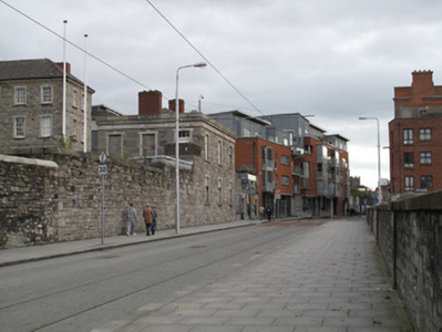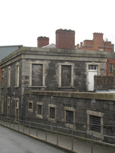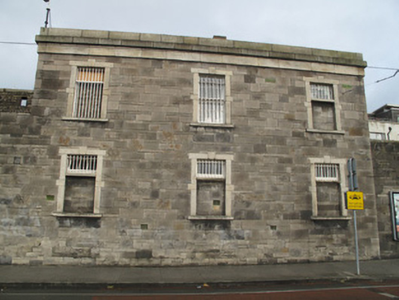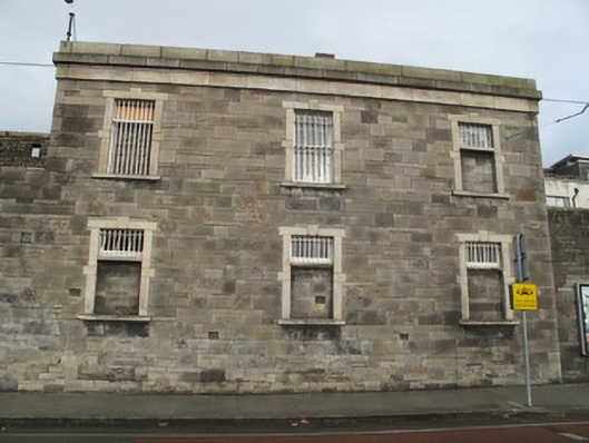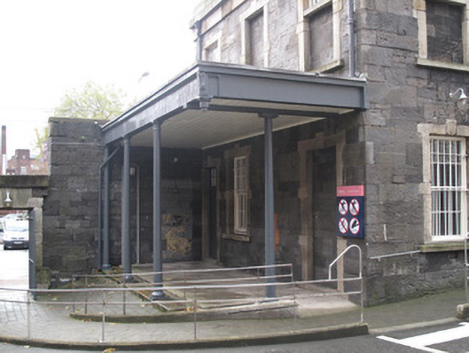 Attached three-bay two-storey guard house adjoining boundary wall of former Collins Barracks, erected c.1840, having steel and timber canopy supported on cast-iron columns to front (east) elevation. Now disused. Hipped slate roof, red brick chimneystacks, raised granite parapet with granite platband and fascia. Cast-iron rainwater goods. Cut snecked calp limestone walls. Cast-iron post box by W. T. Allen, c.1890, having insignia of Queen Victoria, to north elevation. Square-headed window openings with dressed granite surrounds, keystones, and sills throughout. Six-over-six pane timber sash windows to some, some partially blocked with timber frame windows to upper parts, some blind. Some having wrought-iron railings. Square-headed door openings to ground floor to front, dressed granite surrounds and keystones, timber battened door, overlight and granite step to one, other blind. Square-headed door opening to first floor to rear, dressed granite surround and keystone, timber battened door and tripartite overlight, accessible via flight of granite steps.