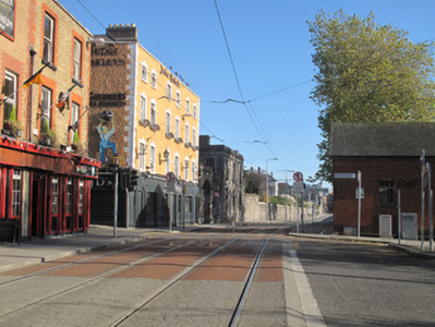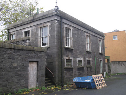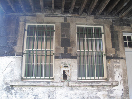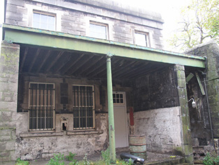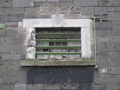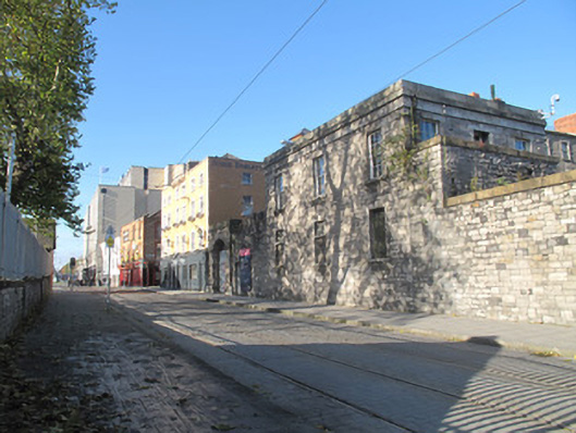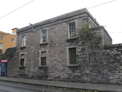 Attached three-bay two-storey guardhouse adjoining boundary wall of former Collins Barracks, erected c.1840, having steel and timber canopy supported on cast-iron columns and calp limestone piers to front (west) elevation. Now disused. Hipped slate roof, red brick chimneystack, raised granite parapet with granite platband and fascia. Cast-iron rainwater goods. Snecked calp limestone walls, cut calp block-and-start quoins. Remains of cast-iron post box to front, now in disrepair. Square-headed window openings with dressed granite surrounds, keystones, and sills throughout. Six-over-six pane timber sash windows and timber framed windows, some partly blocked, some wholly blocked, some having wrought-iron railings. Square-headed door opening to ground floor to front, dressed granite surround and keystone, timber battened door, overlight and granite step. Square-headed door opening to first floor to rear (east) elevation, dressed granite surround and keystone, timber battened door and tripartite overlight, accessible via flight of granite steps.