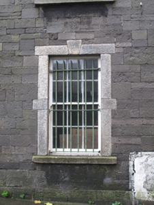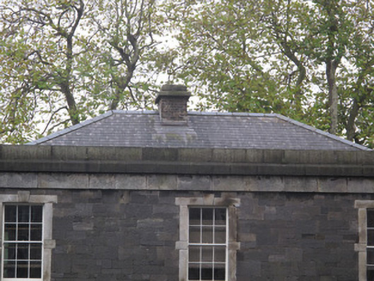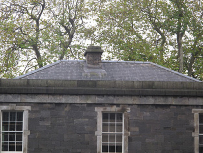 The wall enclosing the Royal Barracks to the south was constructed to designs by Francis Johnston in 1816, although this guard house appears to have been a later addition, providing a sense of context for the adjacent gateway. Well composed, it makes a strong, formal architectural statement, with granite dressings used to good effect to enhance the calp walls. It fulfilled an important function in housing guards who controlled entry to and exit from the barracks.