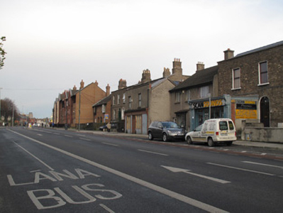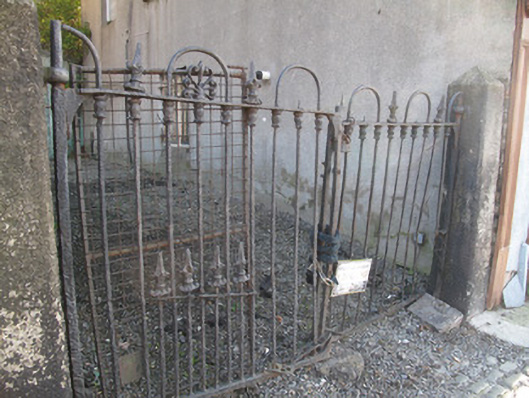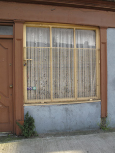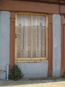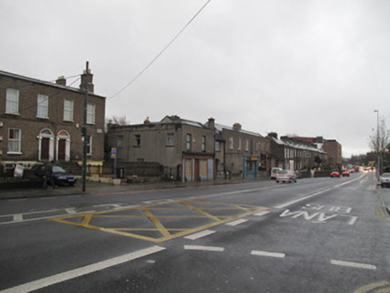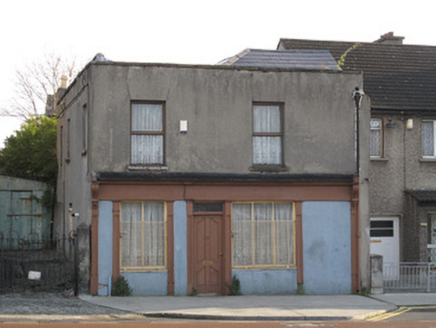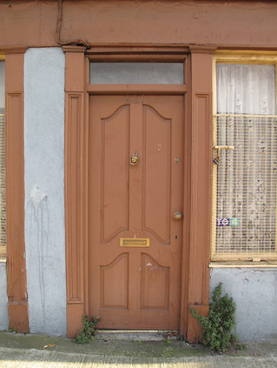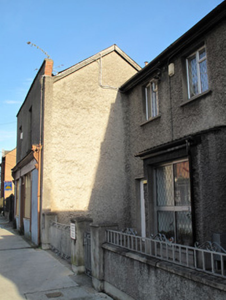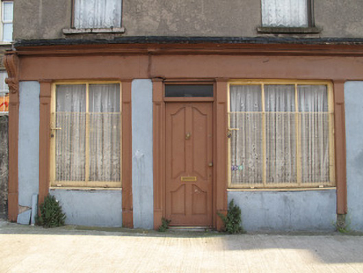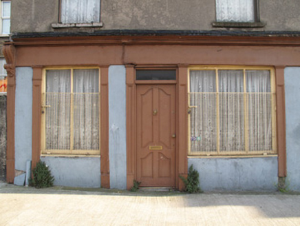 Attached two-bay two-storey house, built c.1800, having disused shopfront to front (west) elevation. Pitched slate roof, hipped to east end, with monopitch roof to north, rendered chimneystack with clay chimneypots, raised rendered parapet having granite coping to front (west) and north elevations, cast-iron rainwater goods. Lined-and-ruled rendered walls. Square-headed window openings with raised render reveals, painted masonry sills, replacement uPVC windows. Timber shopfront comprising panelled pilasters supporting fascia and cornice, flanked by scrolled consoles, square-headed bipartite and tripartite timber-framed display windows on render risers, having steel grilles. Square-headed door opening having timber panelled door and overlight. Double-leaf cast-iron gate flanked by square-profile granite piers to yard to north of building.