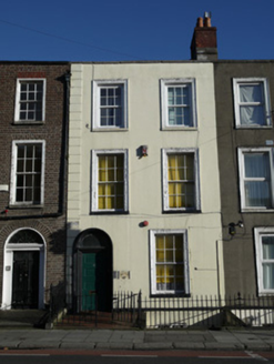 Pair of terraced two-bay three-storey over basement houses, c.1800. Pitched M-profile roofs behind parapets with red brick chimney stacks on rendered bases, and concealed rainwater goods with cast-iron hopper and downpipe. Rendered, ruled and lined red brick Flemish bond walls on cut-granite chamfered stringcourse on rendered, ruled and lined base with rusticated rendered piers to ends. Round-headed door openings with moulded rendered doorcase (north) and rendered doorcase (south), moulded rendered surrounds, replacement timber panelled doors having overlights. Square-headed window openings with cut-granite sills, moulded rendered surrounds, and six-over-six timber sash windows (north) and replacement uPVC casement windows (south). Street fronted with urn finial-topped wrought iron railings.