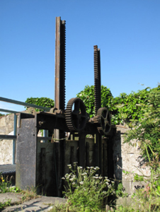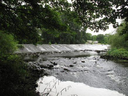 Mill race from River Liffey, built c.1770, created by rubble stone sluice constructed to north of river. Rubble stone retaining wall to north, recent concrete retaining wall to north of east of mill race. Timber sluice gate having cast-iron lifting mechanism to north.