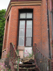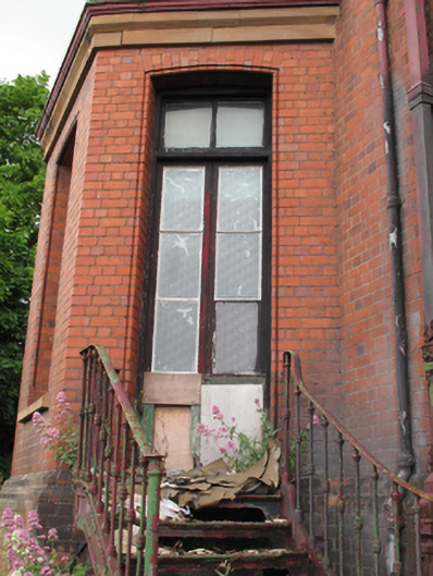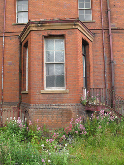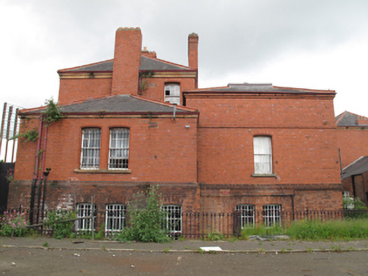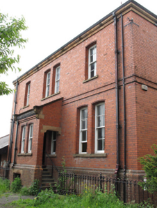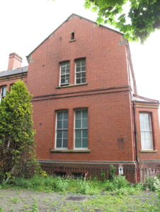 Attached five-bay two-storey over basement former officers' quarters, dated 1889, having breakfronts to either end of front (west) elevation, that to south gabled, returns and later additions to rear (east) elevation. Gabled porch to front, canted bay window to south, lean-to porch to north elevation. Pitched and hipped slate roofs, with terracotta ridge tiles, red brick chimneystacks having some clay chimney pots, carved terracotta eaves course, and cast-iron rainwater goods. Some granite coping. Red brick, laid in Flemish bond, to walls, red brick string courses, chamfered brown brick plinth course over basement level. Moulded terracotta date plaque to front of porch to front. Paired and single segmental-arched window openings with six-over-six pane and four-over-four pane timber sash windows, bull-nosed surrounds and carved granite sills. Some cast-iron railings to windows. Round-arched door opening to porch to front, bull-nosed red brick surround, dropped terracotta keystone and terracotta impost blocks, double-leaf timber panelled door and plain fanlight. Door opening onto rendered platform and steps flanked by cast-iron railings on brick plinth wall with carved granite coping. Cast-iron bootscrape to platform. Segmental-arched door opening to canted bay window to south elevation, carved red brick surround, double-leaf glazed timber door and overlight, opening onto cast-iron steps having flanking cast-iron railings. Segmental-arched door opening to south elevation, carved red brick surround, timber panelled door and overlight, opening onto timber platform flanked by cast-iron railings. Shouldered opening to porch to north elevation, carved terracotta lintel, recessed door opening accessed via tiled steps with cast-iron handrail.