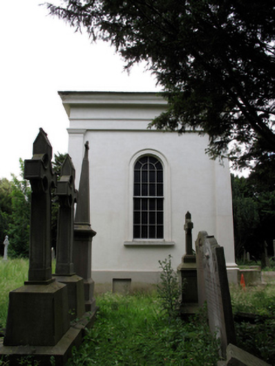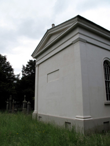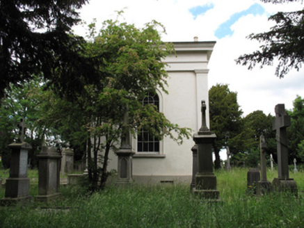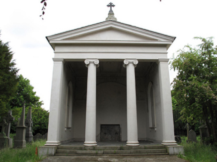 Freestanding rectangular-plan double-height pedimented mortuary chapel, built c.1830, having pedimented prostyle Ionic portico to front (west) elevation. Pitched roof having cross finial to front elevation, moulded cornice, chimney and pediment to rear. Rendered walls over rendered plinth, corner pilasters having moulded cornice and base, rectangular recess to rear (east) elevation. Round-headed window openings to north and south elevations, having painted stone sills and moulded surround, fourteen-over-twelve pane timber sash windows, blocked internally. Interior having plastered ceiling with moulded panels having rosette to centre. Blocked window openings having timber sill and moulded surround. Blind arch to east elevation having moulded capitals to piers. Gravel surface to floor, having remnants of paving. Located on raised podium having granite steps, rendered surface and granite block perimeter, accessed by pathway in landscaped surrounds. Set in centre of cemetery.
