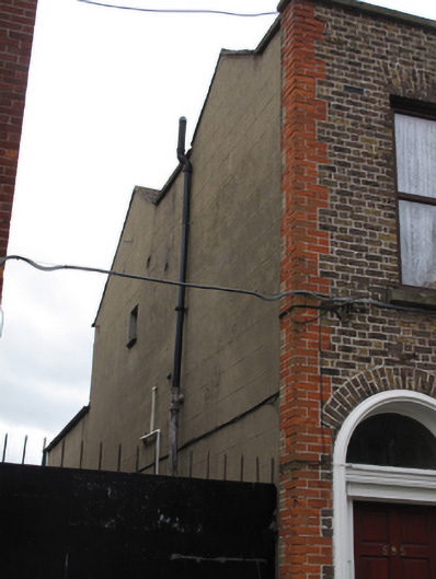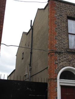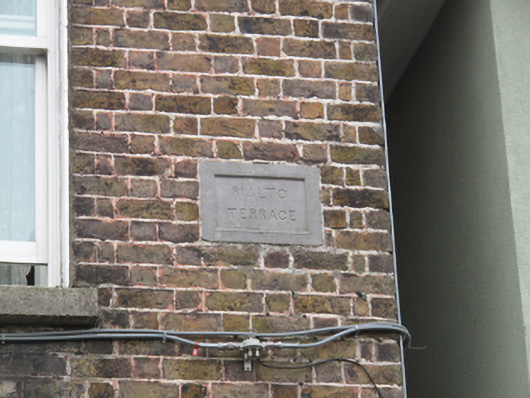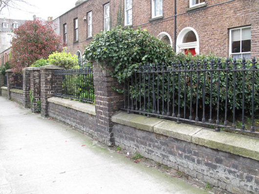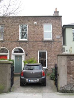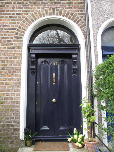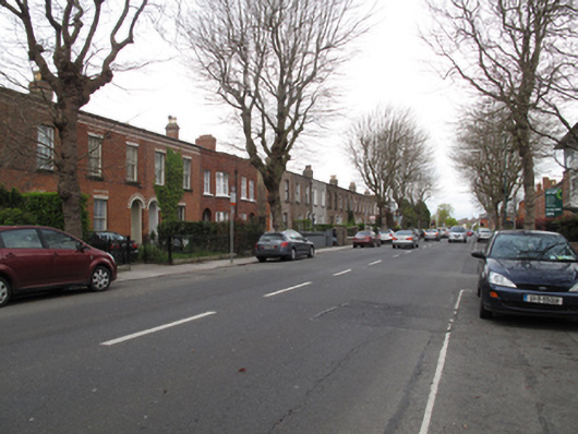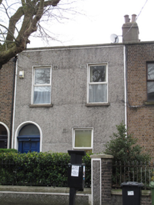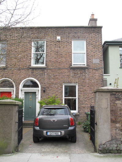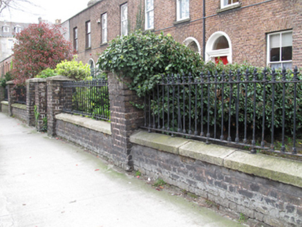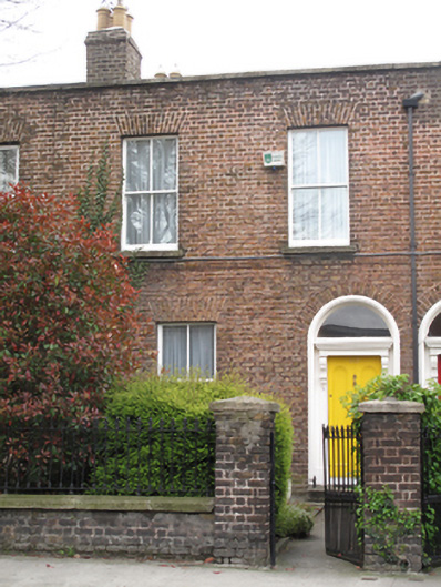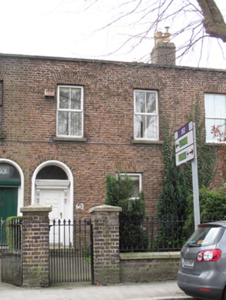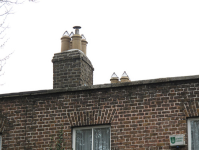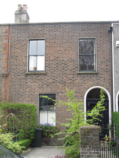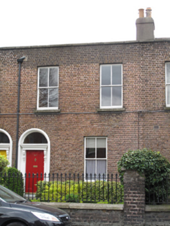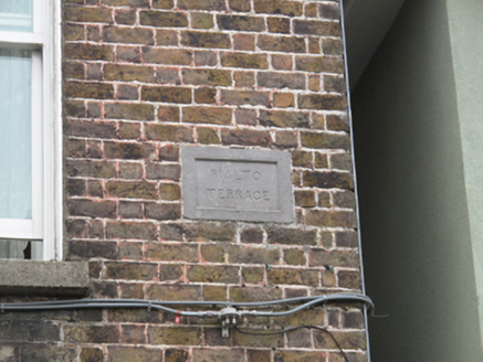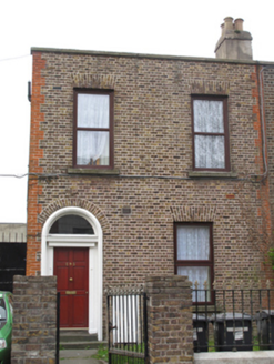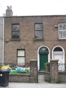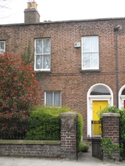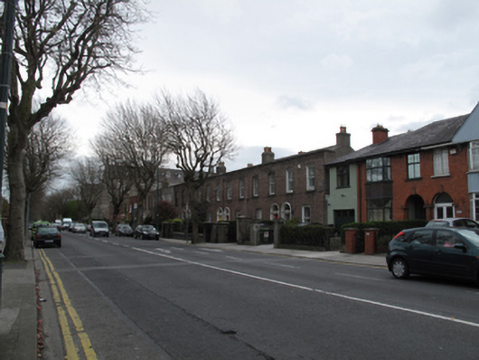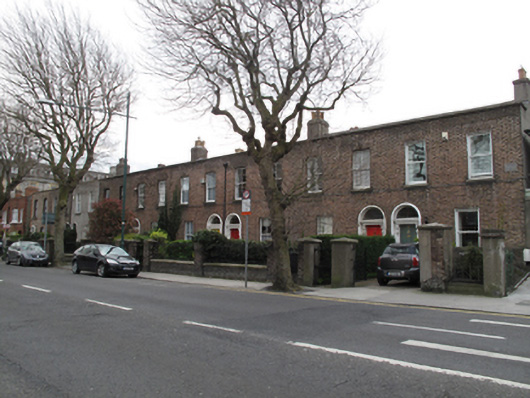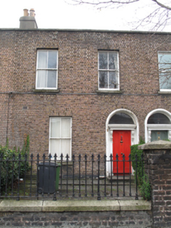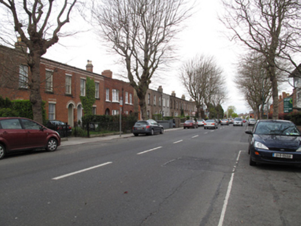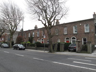 Terrace of nine two-bay two-storey houses, built c.1865, having returns to rear (south) elevation. M-profile pitched slate roof with terracotta ridge tiles, rendered and red brick chimneystacks having clay chimney pots, hidden behind raised red brick parapet with granite coping. Red brick walls, laid in Flemish bond to front, inscribed limestone name plaque to west end of façade, roughcast render to No.599, red brick block-and-start quoins to No.595. Rendered walls to east and west elevations. Square-headed window openings, red brick voussoirs, granite sills and timber sash windows, one-over-one and two-over-two panes, some replacement uPVC windows. Round-headed door openings with painted masonry doorcases having scrolled consoles supporting cornices, forming base for plain fanlights, timber panelled doors opening onto granite steps, some having cast-iron bootscrapes. Cast-iron railings to garden boundary, set in red brick plinth wall with masonry coping, matching square-profile piers flanking cast-iron pedestrian gates to entrances.