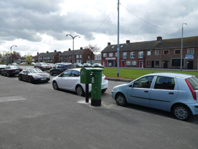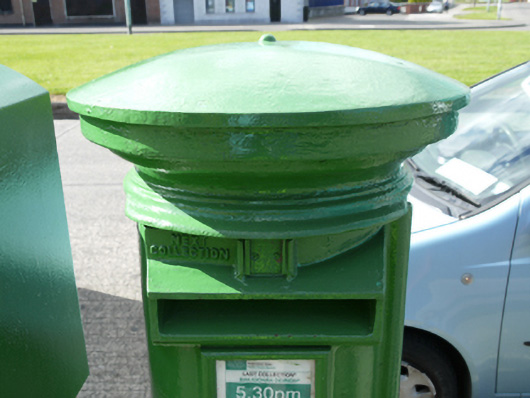Freestanding cast-iron pillar post box, erected c.1960, comprising moulded neck, shallow domed cap, curved hinged door having letter slot and circular raised panel. Foundry mark ‘CARRON SCOTLAND’. Located on footpath south of Walkinstown Green.