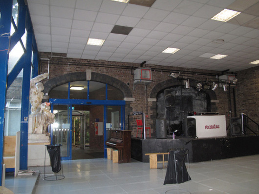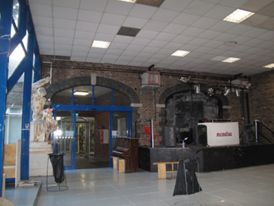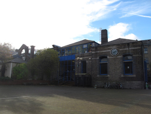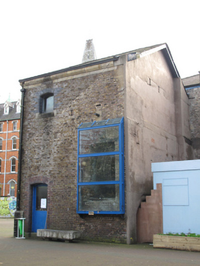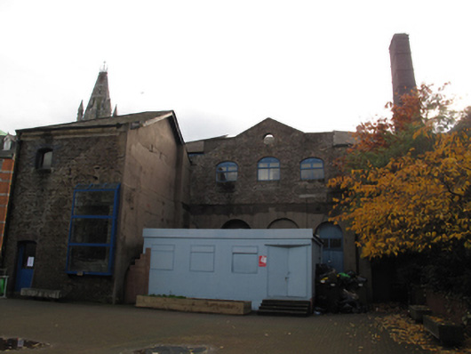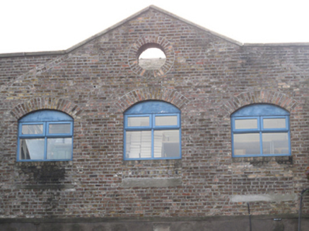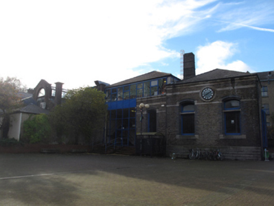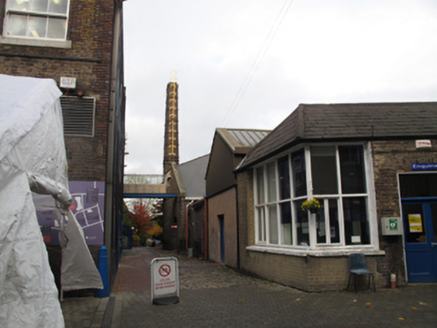 Attached double-height gable-fronted former distillery, built c.1870, having square-profile chimney to front (west) elevation, single-storey three-bay extension to south, curved corner to north-west and two-bay projecting engine house to north. Now in use as art college. Hipped artificial slate roof with terracotta ridge tiles and recent rooflights. Raised barges with render coping. Granite coping to parapets. Brown brick to chimney, granite coping and cast-iron quoins and braces. Recent steel ladder adjoining south elevation. Truncated segemental-headed openings flanking base of chimneystack to front, red and black brick surrounds, some cast-iron machinery, blocked. Pediment to parapet to north elevation, oculus to apex. Brown brick laid in Flemish bond to walls. Granite eaves course, platbands and rusticated granite plinth course having carved granite coping to rear (east) elevation of engine house. Rendered walls to west elevation of engine house and to ground floor to north elevation. Cast-iron wheel stops to corners to front. Bull-nosed black brick piers to front of extension to south. Square-headed opening to basement level to front, cast-iron frame, opening blocked. Clock face to engine house, carved granite surround. Segmental-headed window openings to north elevation, replacement timber-framed windows. Segmental-headed window openings to east elevation of engine house, bull-nosed black brick surrounds, chamfered granite sills and carved granite hood moulding, replacement timber framed windows. Square-headed opening to north elevation of engine house, recent glazed panel over, remains of beam engine visible to interior. Carriage arches to south elevation, now contained within recent addition, elliptical-headed arches, bull-nosed moulded black brick surrounds and granite keystones. Round-headed door openings to front of single-storey extension to south, black brick bull-nosed voussoirs, recent timber door and plain fanlight to opening to south, blocked to opening to north. Round-headed door opening to ground floor to north elevation, double-leaf timber battened door and part-glazed tympanum. Segmental-headed carriage arch to front, double-leaf timber battened door. Segmental-headed door opening to east elevation of engine house, bull-nosed voussoirs and half-glazed timber battened door.