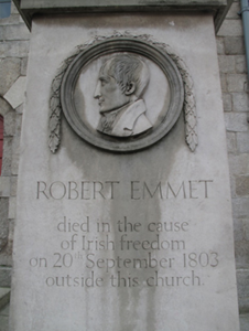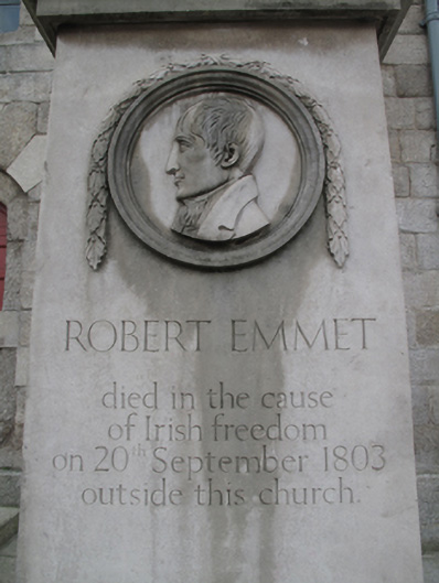 Robert Emmet was a member of the United Irishmen, and led an attempted rebellion against British rule in 1803. He was subsequently captured, tried for treason and executed in front of Saint Catherine’s Church on 20th September 1803. This monument marks the site of his death, adding to the building's historic setting. The carefully carved and detailed profile adds artistic value to the streetscape.