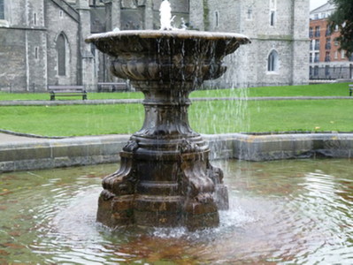 Saint Patrick’s Park, located to the north of the cathedral, was opened by King Edward VII in July 1902. It is bounded by Patrick Street to the west, Bull Alley to the north and Bride Street to the east. It was laid out as part of the redevelopment of the area by the Guinness family in the late nineteenth and early twentieth centuries and provides an attractive setting for both Saint Patrick’s Cathedral and the Iveagh Play Centre. The landscaping was the work of Mr. Crasp of Chester and the construction work was undertaken by engineer Mr. Arthur Dudgeon. The geometric landscaping is enhanced by the two stone fountains on the park's principal axis and a modern sculpture of a steel bell by Vivienne Roche. A brick terrace was constructed to cope with the fall in ground level between Bride Street Patrick Street, the upper level of which was used as a bandstand while the lower level provided a sheltered seating area.