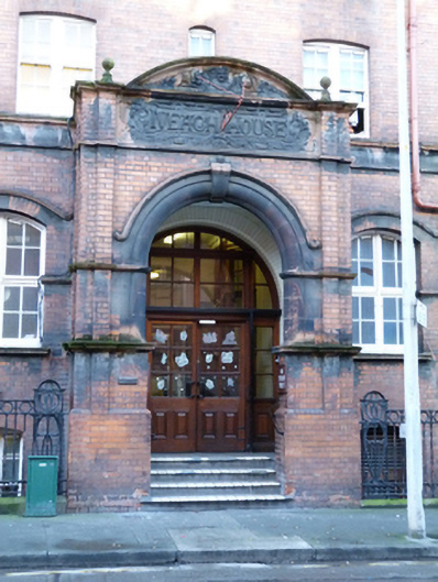 The Iveagh Hostel, formerly Iveagh House, is part of the Iveagh Trust Scheme, the most significant urban renewal scheme undertaken in Dublin in the late nineteenth and early twentieth centuries. The design is attributed to the London firm of Joseph & Smithem assisted by Kaye, Parry & Ross. The ground plan, which comprised a narrow front block and three radiating arms enclosing the rear courtyards, was chosen to provide access to fresh air and sunlight. Described on completion as ‘a palatial workmen’s hotel’ it contained over five hundred cubicles on the upper floors and public facilities including a dining room, smoking room and reading room on the ground floor. Amenities available to the inhabitants included a wash-house and barber’s shop. The 1911 census indicates it provided lodgings for labourers, clerks, skilled tradesmen and pensioners, and had a resident staff of seventeen. The austere red brick exterior is lent definition by an arcaded ground floor, the string courses and angled brick dressings, with little ornamentation other than the terracotta cartouche with well-executed lettering over the entrance. The decorative appearance of a mansard roof with dormer windows is a clever conceit which belies the flat roof, a feature that gained popularity in early-twentieth-century Dublin.