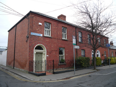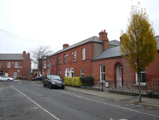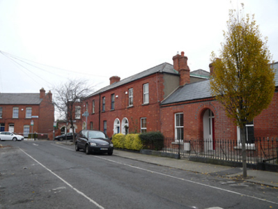 Terrace of three two-bay two-storey houses, built c.1890. M-profile hipped artificial slate roof with moulded red brick eaves course, and red brick chimneystacks having red brick cornices. Red brick walls laid in Flemish bond to front elevation and north gable, rendered walls south gable. Square-headed window openings having cut granite sills, one-over-one timber sash windows and replacement uPVC windows. Round-headed door openings having painted timber surround with carved corbels, plain fanlights, and timber panelled doors. Front gardens having cast-iron railings on cut granite plinths with cast-iron pedestrian gates. Some tiled garden paths.