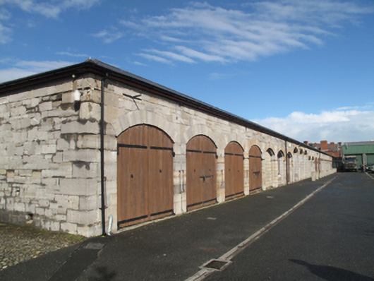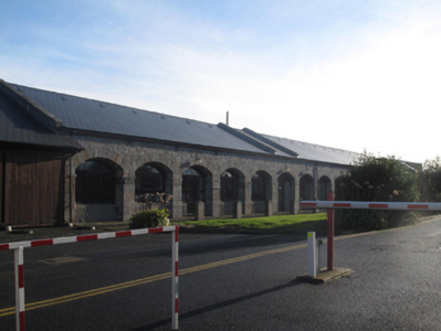 Detached L-plan single-storey former gun carriage store, built c.1805, having thirteen-bay west elevation and thirty-one-bay south elevation. Now in use as offices. Pitched slate roof with red brick chimneystack, raised render coping and cast-iron rainwater goods. Dressed calp limestone walls, with arcades of segmental-headed arches to west and south elevations. Recent replacement uPVC windows inserted in arcade. Square-headed uPVC doors with sidelights and overlights. Cobbled footpath to front of west elevation, and round-headed bollards to front of openings.