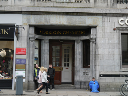 Corner-sited three-storey L-plan commercial building with attic storey, built 1901-3, having seven bays to Nassau Street, three-bay curved corner over canted ground floor, and five bays to Dawson Street. Roof is single-pitched to front third, flat to rear third, hipped slate to middle third of Dawson Street section and Mansard profile to middle third of Nassau Street section; front elevations having moulded limestone crown cornice; copper-clad ribbed corner dome having cornice and recessed frieze; clock to front face; ten substantial ashlar limestone chimneystacks with moulded over-sailing caps and multiple pots; and concealed gutters. Ashlar limestone walling with plinth rising to ground floor sill course; first and second floors set back behind stone balustrade; attic storey set back over deep moulded stone cornice on Giant Order Ionic columns, paired to penultimate bay of each elevation; and with single columns dividing corner bays. Rear elevations of brick. Square-headed window openings grouped in twos and threes to all but second floor, latter having Diocletian windows with archivolts supported on pilasters that continue to floor below. Paired round-headed windows to ground floor at Dawson Street elevation only, with square-headed surrounds and slender colonnettes for central mullions. Nassau Street elevation has replacement shopfronts to ground floor. First floor windows in threes divided by square-headed Doric pilasters supporting moulded archivolt. Attic storey windows in pairs with plain mullion and studded architraves. Ornate carving to apron panels between first and second floors of corner bays. End bays to each elevation have plainly detailed pairs of windows to first and second floors. Square-headed entrance opening to curved corner having architrave carved in deep relief with fruit and ribbons, and with keystone; entrance deeply recessed with double-leaf panelled oak doors. Mainly tripartite square-headed windows to rear elevations. Wide square-headed opening to Nassau Street, comprising concave classical entrance ensemble of four panelled pilasters with polished granite fascia with incised gilded lettering 'Morrison Chambers' and double-leaf varnished timber door with glazed upper panels flanked by plain timber windows. Ground floor entrance hall interior has paintings to vaulted ceiling featuring coats of arms of the four provinces, and black and white marble floors. Dentillated cornice and coffered ceilings to principal ground floor room, elaborately carved timber surrounds to door openings, windows and over marble fireplaces, and elaborate carving with classical motifs and devices to panelling. Triangular yard to rear.