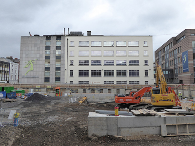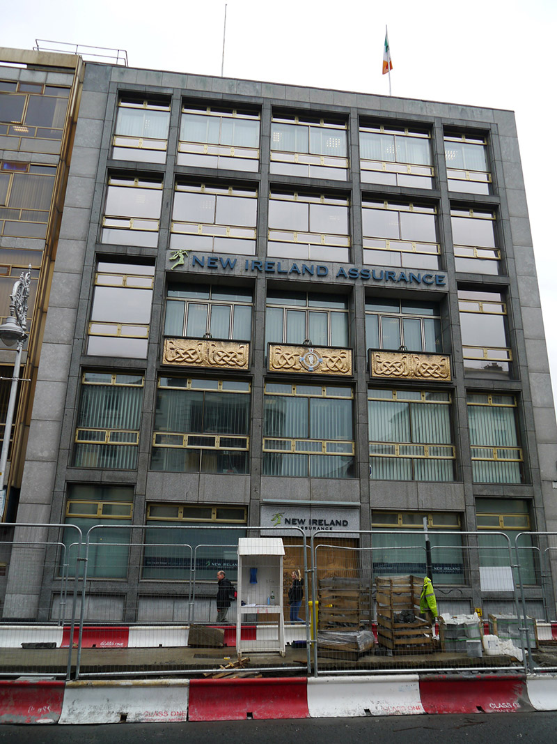This impressive series of twentieth-century blocks was built between 1929 and 1971 as the headquarters of the New Ireland Assurance Company. The corner block of 1964 gives a front onto Dawson Street of their earliest block of 1929-30 on Dawson Lane and is fine example of a building in the Modernist style, overlaid with Gaelic lettering and Celtic motifs and detailing. The earlier block was designed by Vincent Kelly in a severely rectilinear manner and is part of an interesting group of public and corporate buildings of the same era. The 1964 block, by O'Brien, Morris and McCullough, presents a highly decorative exterior. It is characterized by strong proportions, achieved through the balance of uniformly spaced and subtly graded strips of glazing, given horizontal emphasis by rows of gold-framed casements, and balanced by a slender frame, all arranged about a slightly recessed central panel fronted by unusual gold Celtic-themed panels that form balcony parapets. The quality detailing is enhanced by the use of high-quality materials, including granite facing panels, gold-coloured window frames, and an impressive, fine gold-painted metal door that features emblems of the four provinces of Ireland, again reinforcing the theme of the building as representing the Irish nation. The façade is little altered and makes a robust and highly decorative contribution to the architectural variety and quality of Dawson Street, as well as to the twentieth-century architectural heritage of Dublin. The latest block of 1971 to its north, also facing Dawson Street, was designed sympathetically and enhances the setting of the 1964 block. The whole represents a fascinating example of changing architectural styles spanning four decades of the twentieth century and makes a striking impact on Dawson Street.